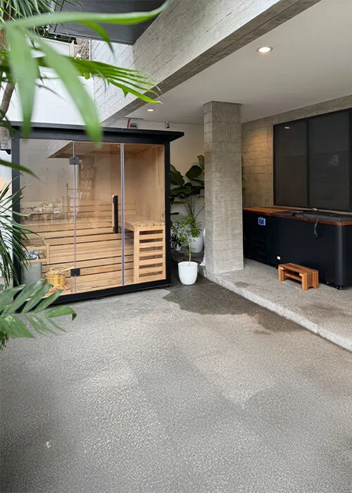 A modern sauna and cold plunge combination installed on the ground floor of a corporate building.