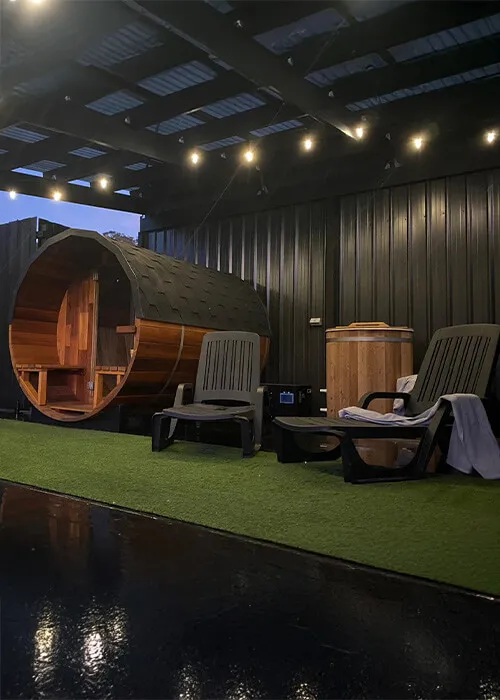An outdoor spa area featuring a barrel sauna and matching barrel cold plunge with lounge seating.