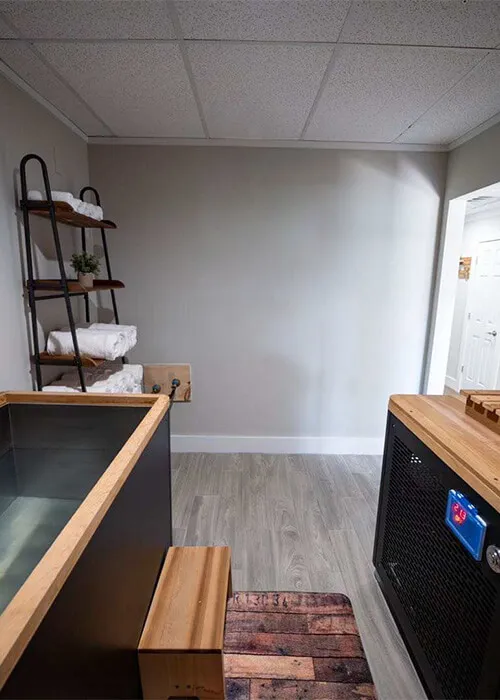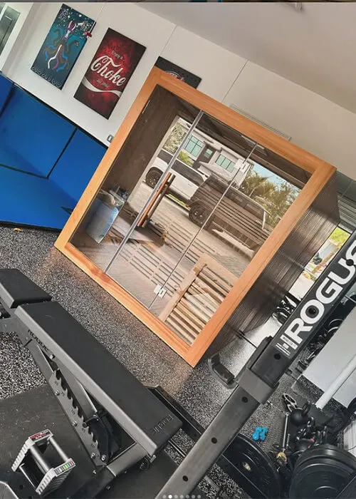 A traditional indoor sauna installed in a gym, paired with a cold plunge for hot-and-cold therapy.