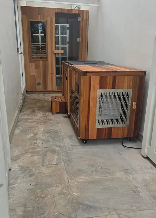 A custom solid wood sauna and cedar cold plunge installed in a client’s home wellness space.